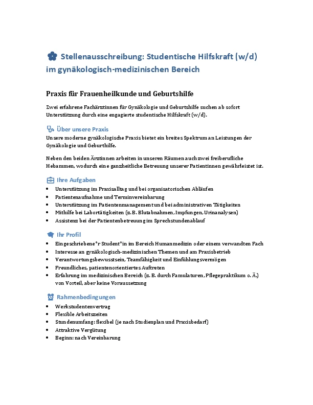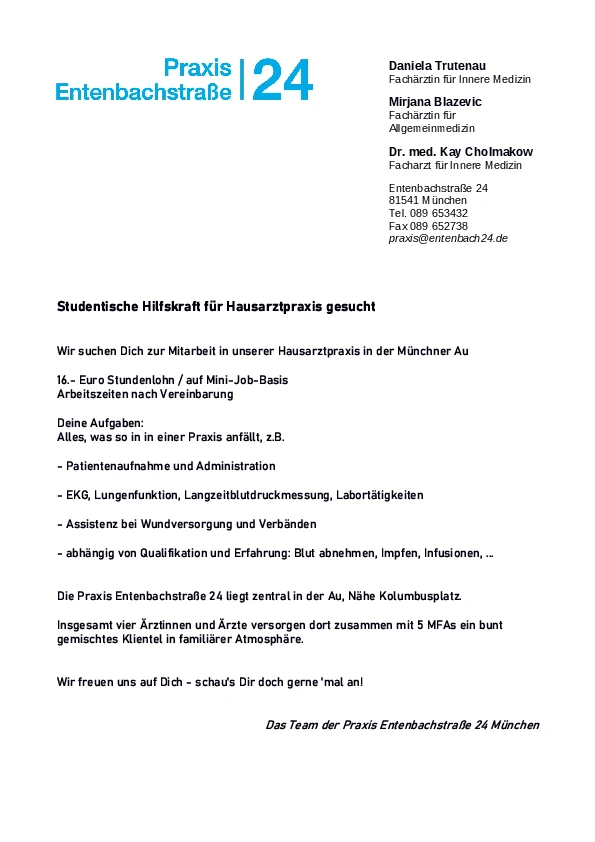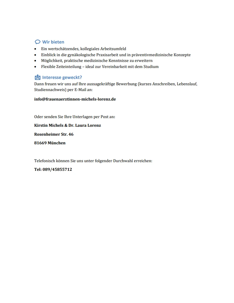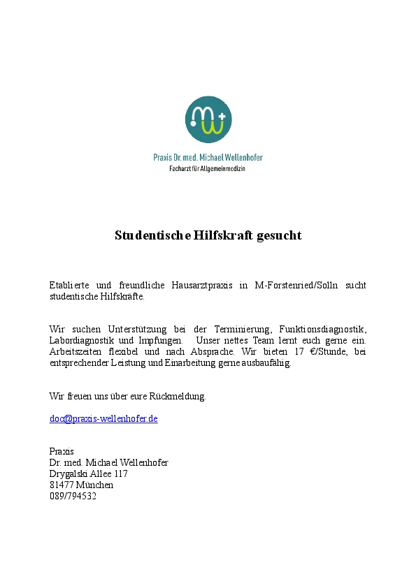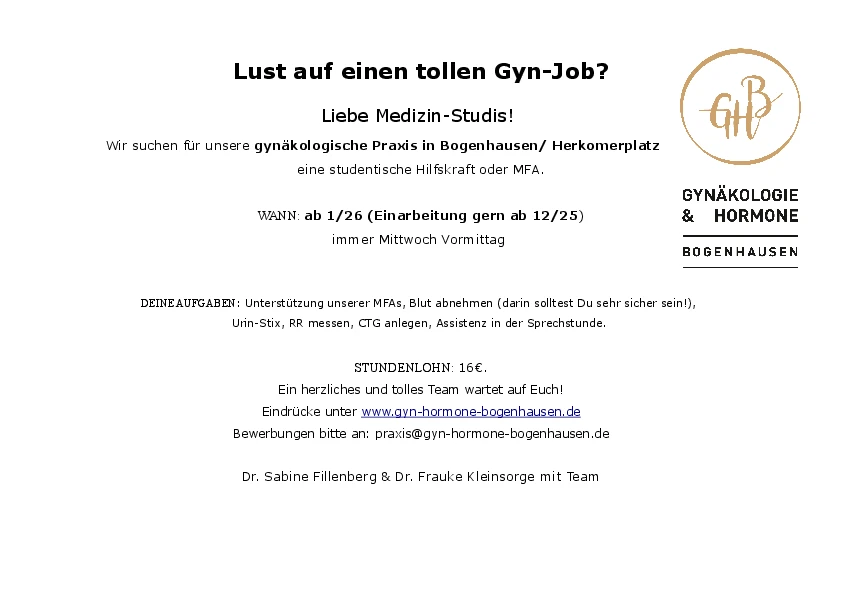 Wir suchen ab sofort eine studentische Hilfskraft für unsere gynäkologische Gemeinschaftspraxis am Pasinger Bahnhof.